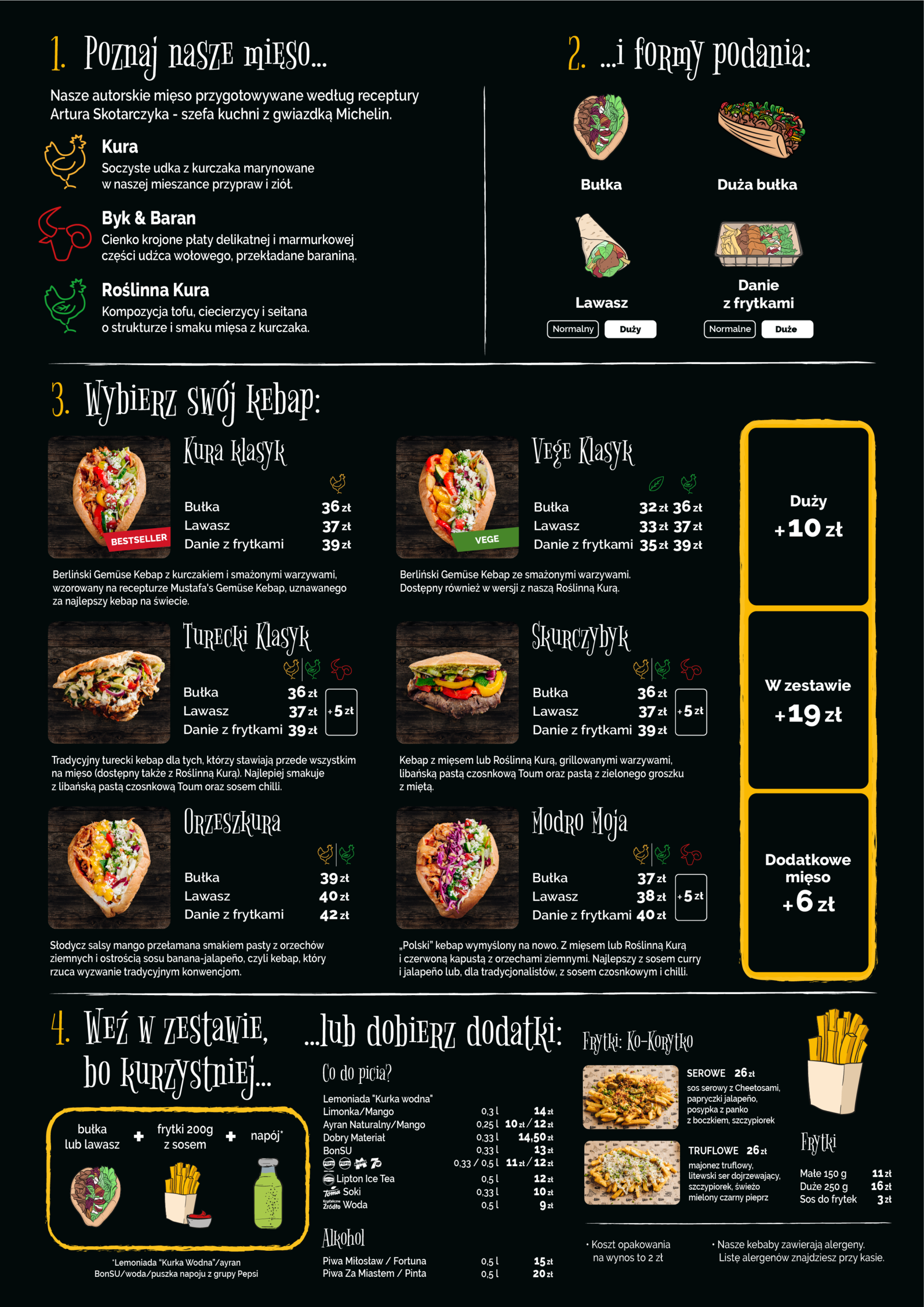 Historia Kury Warzyw zaczęła się od kulinarnej podróży założycieli, którzy przemierzyli tysiące kilometrów, odkrywając tajniki kebaba w Niemczech, Turcji i Polsce. Efektem ich wypraw oraz współpracy z Arturem Skotarczykiem, poznańskim szefem kuchni dwukrotnie nagrodzonym gwiazdką Michelin, jest menu pełne niepowtarzalnych smaków. W naszej ofercie znajdziecie m.in. klasyczny berliński gemüse kebab z kurczakiem, turecką wersję z grillowanymi warzywami i wołowo-baranim mięsem, a także nowoczesne propozycje, takie jak kebab fusion z salsą mango – ulubieniec naszych Gości.